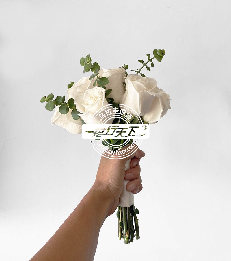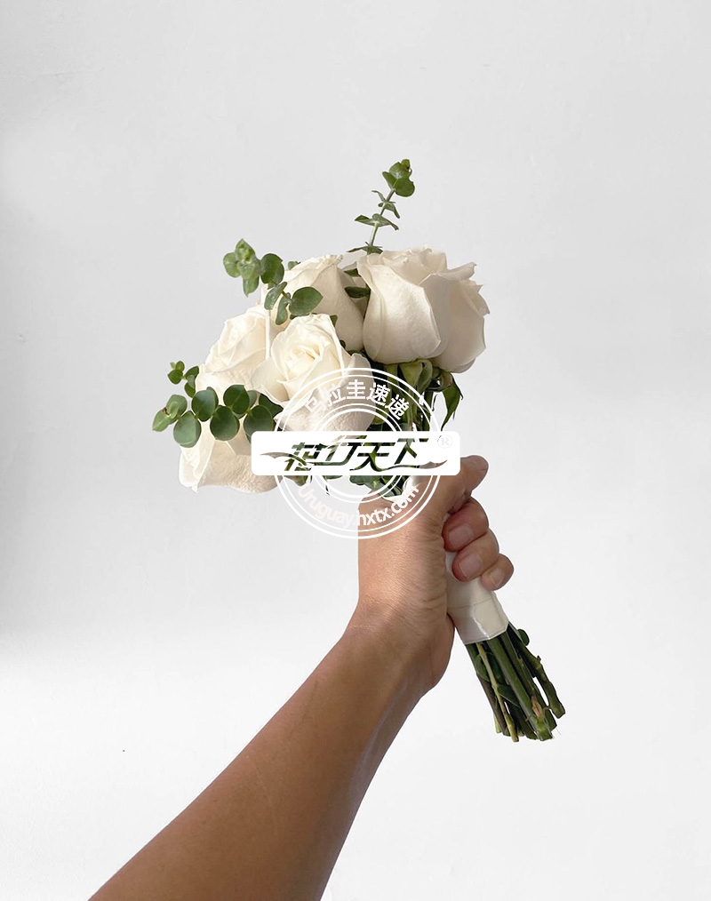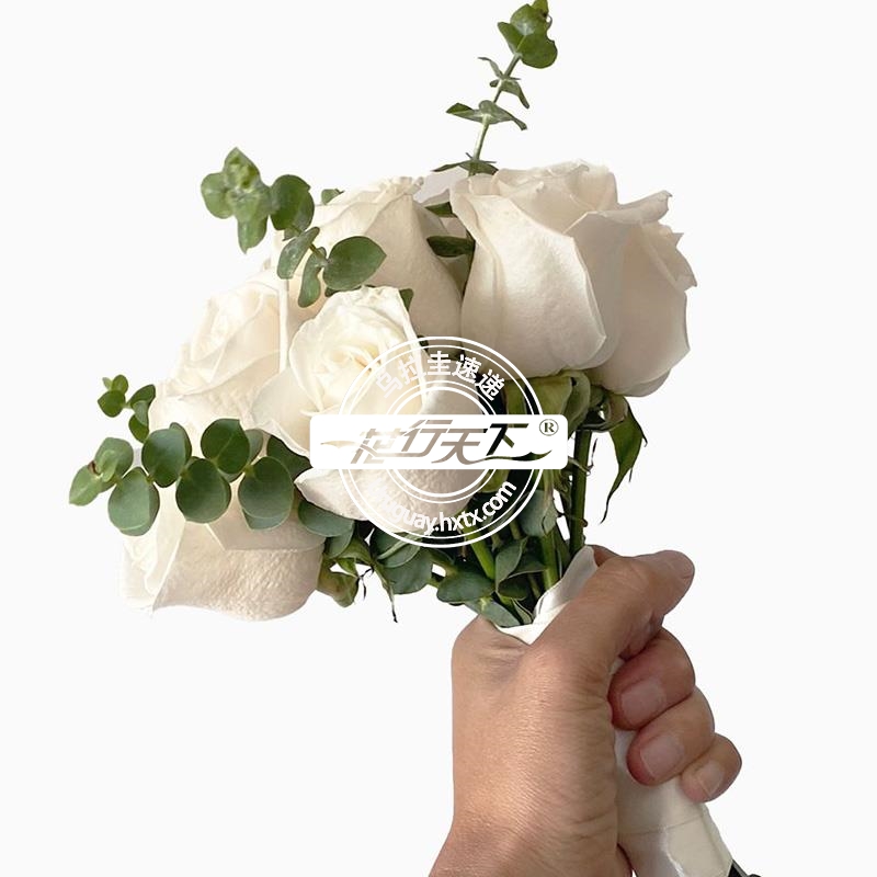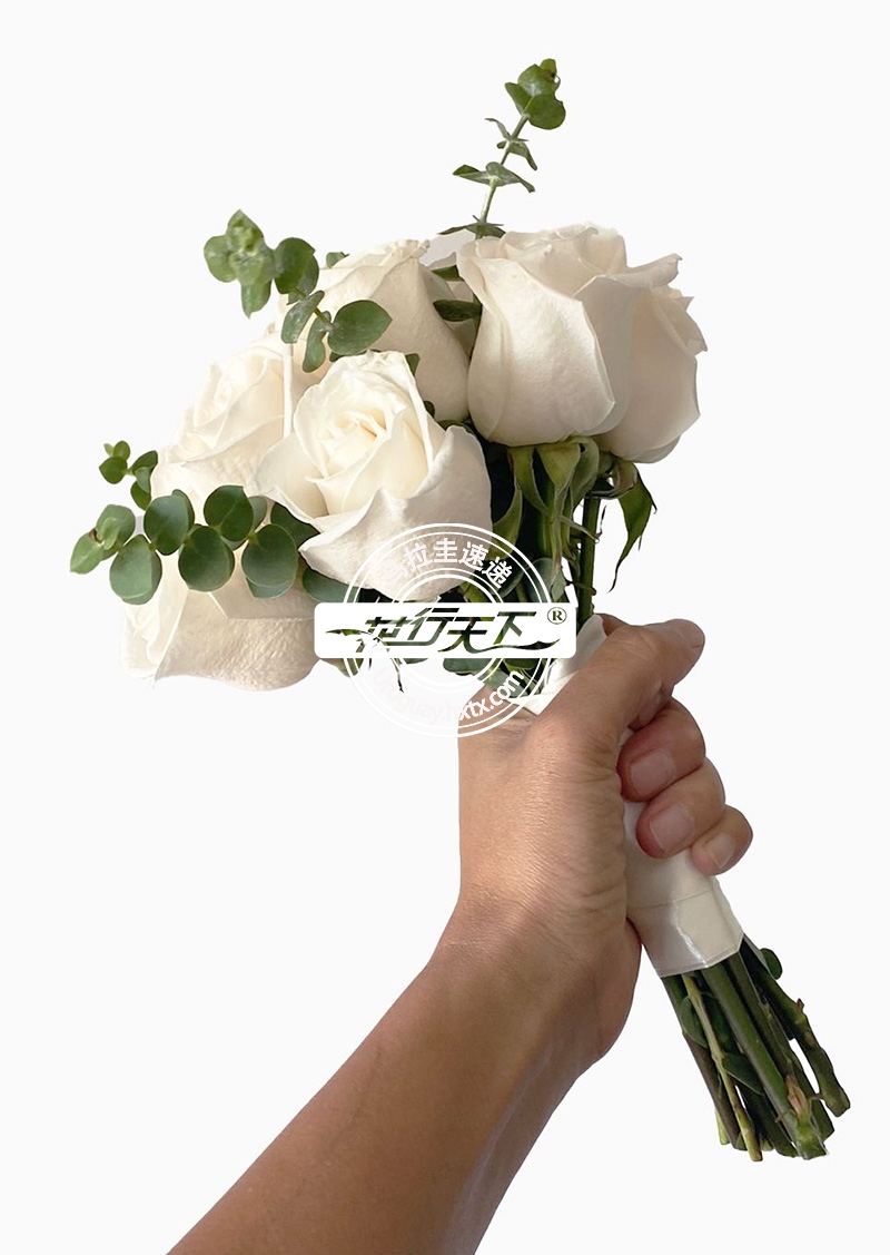 描述: 12枝白玫瑰、配时令绿叶组成。