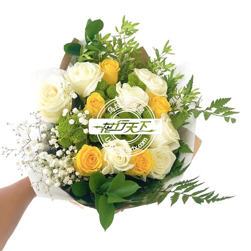 白色、黄色玫瑰12枝、配时令绿叶组成.