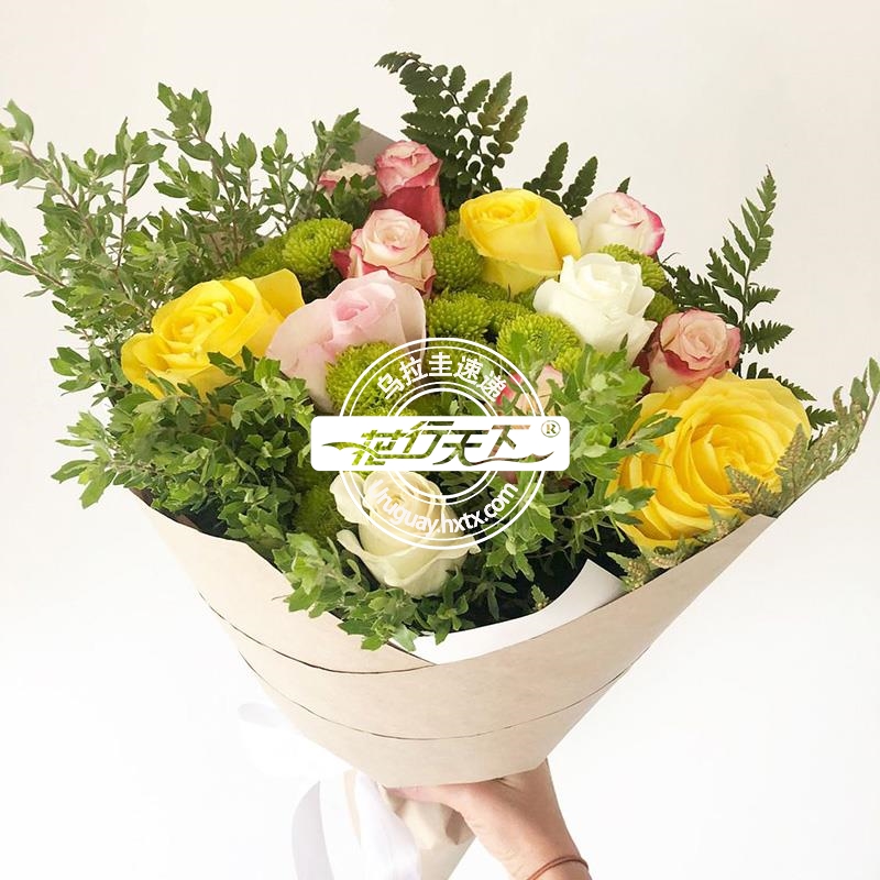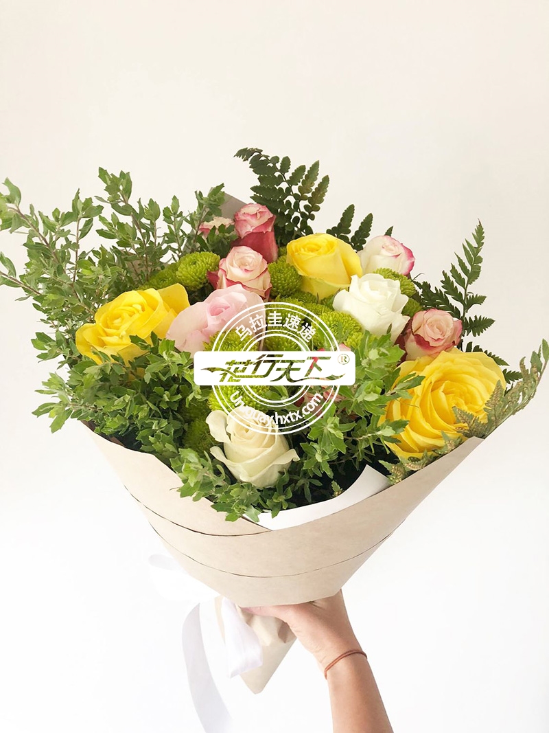 粉色、黄色、粉色玫瑰12枝、配时令绿叶组成.