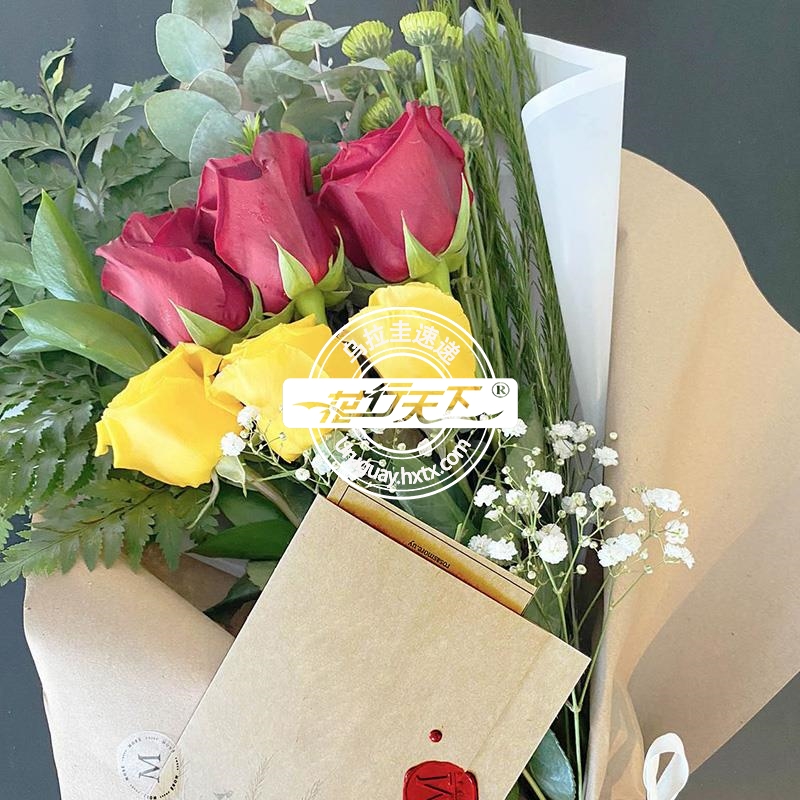 红色、黄色玫瑰6枝、配时令绿叶组成.